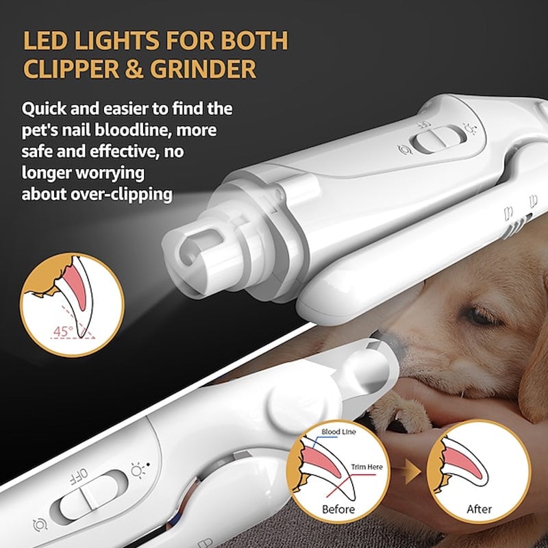 - EFFECTIVE & SAFETY DOG NAIL TRIMMING: This unique dog nail clipper uses an safety stop guard and 2 LED LIGHT design on the end of it that illuminates your dog's nail, allowing you to easily located where the quick is, it better to prevent over-grinding or cutting.